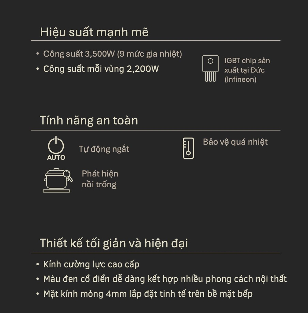 | Tính năng an toàn | Tự ngắt, phát hiện nồi trống, bảo vệ quá nhiệt, khóa trẻ em, đèn báo nhiệt dư |
