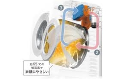 Công nghệ sấy điều hòa không làm hư vải. Quy trình làm khô máy giặt: Làm nóng không khí, hút ẩm thông qua hệ thống bơm nhiệt, đưa luồng gió 4.6/phút vào lồng giặt, hút hơi ẩm trên quần áo và đẩy không khí ẩm vào bơm nhiệt của máy.