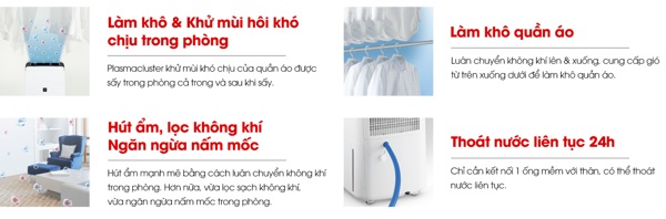 - Chức năng chính: Hút ẩm, Khử mùi, Sấy quần áo, Cảm biến độ ẩm, Tự động dừng, Thoát nước liên tục.