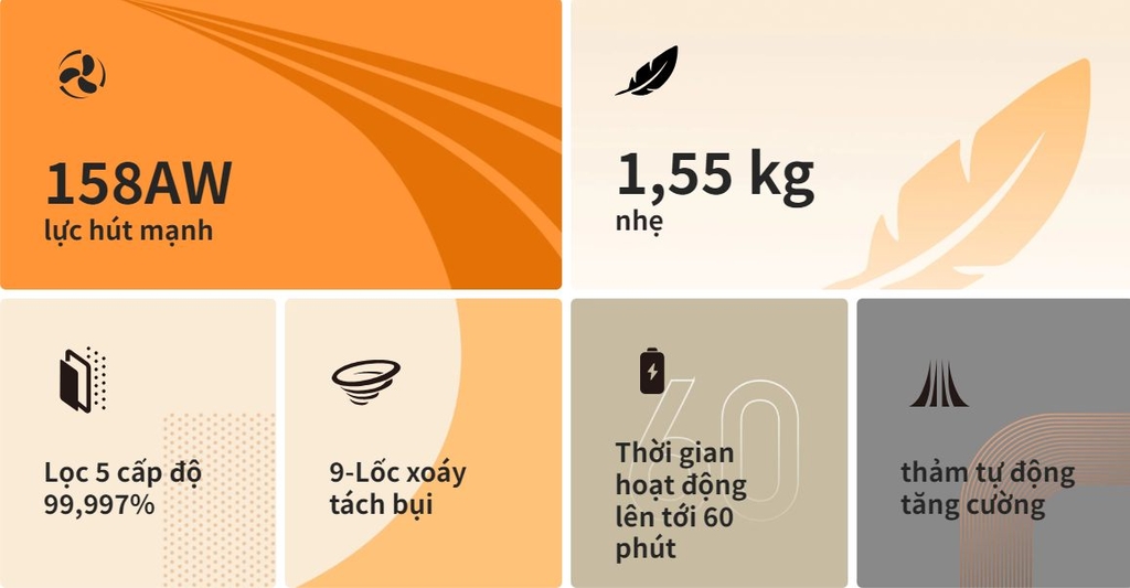 - Hệ thống tách bụi 9-cyclone duy trì lực hút ổn định, không tắc nghẽn.
