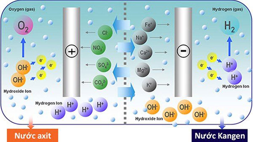 Giai đoạn 2: Nước được lọc từ giai đoạn 1 sẽ được đưa vào buồng điện phân gồm 12 tấm điện cực titan nguyên chất phủ bạch kim. Tại đây, nguồn nước sẽ trải qua quá trình điện phân để phân tách và kết hợp lại các phân tử nước. Cực âm sẽ tạo ra nước ion kiềm và ngược lại, cực dương sẽ tạo ra nước có tính axit.