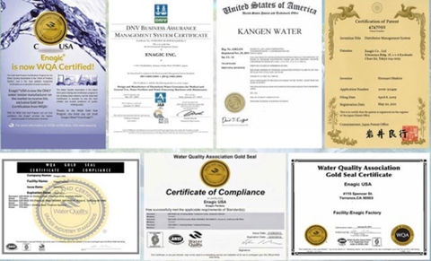 Enagic International là nhà sản xuất máy tạo nước ion kiềm tuân thủ tất cả các tiêu chuẩn về chất lượng nước của Hiệp hội nước quốc tế WQA, Con dấu vàng Gold Seal, và các chứng nhận như: ISO 9001, ISO 14001 và ISO 13485 về quản lý chất lượng và môi trường, và là cơ quan quản lý được cấp phép theo quy định. Công ty được tôn trọng là thành viên của Hiệp hội bán hàng trực tiếp có uy tín.